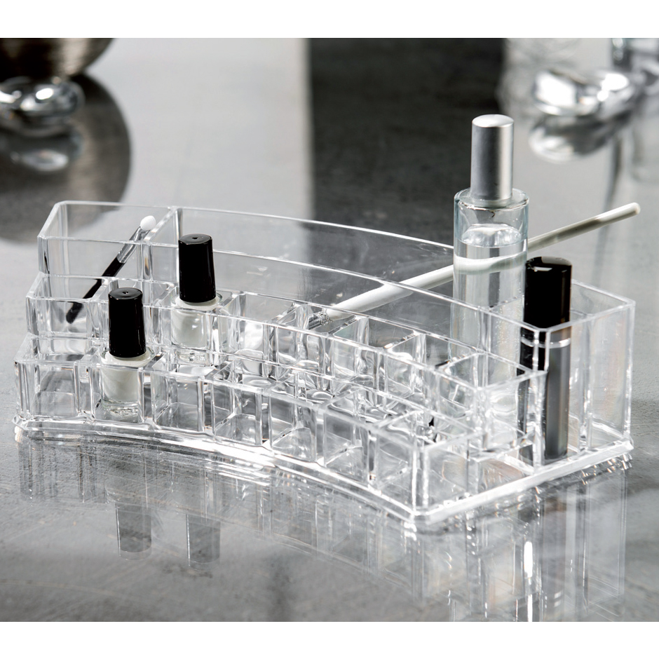 Ten siempre tus productos cosméticos ordenados y a tu alcance para una experiencia de maquillaje más rápida y amena. El organizador de cosméticos de la marca Compactor está realizado en acrílico trans ... sparente, De elegante diseño curvo y dimensiones de 28X12X7 cm., combina muy bien cualquier tipo de decoración. Leer más