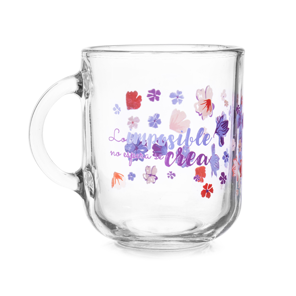 a taza es llamativa y divertida, al mismo tiempo que es cómoda y fácil de agarrar. Su construcción en vidrio implica que está fabricada con un material 100% reciclable, libre de metales pesados, que no guarda olores ni sabores, y que ayuda a conservar la temperatura de la bebida.