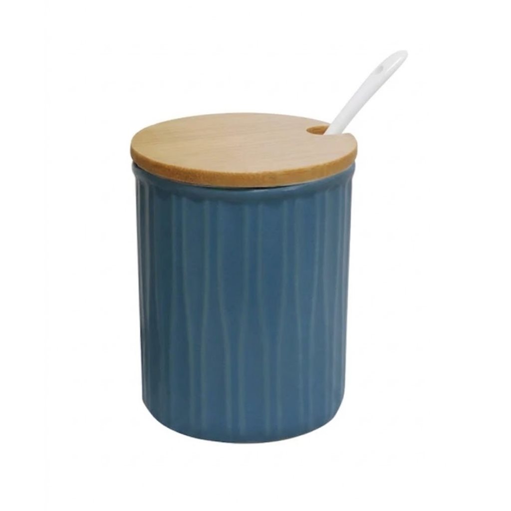 Azucarero/quesera ceramica c/cuchara y tapa madera azul